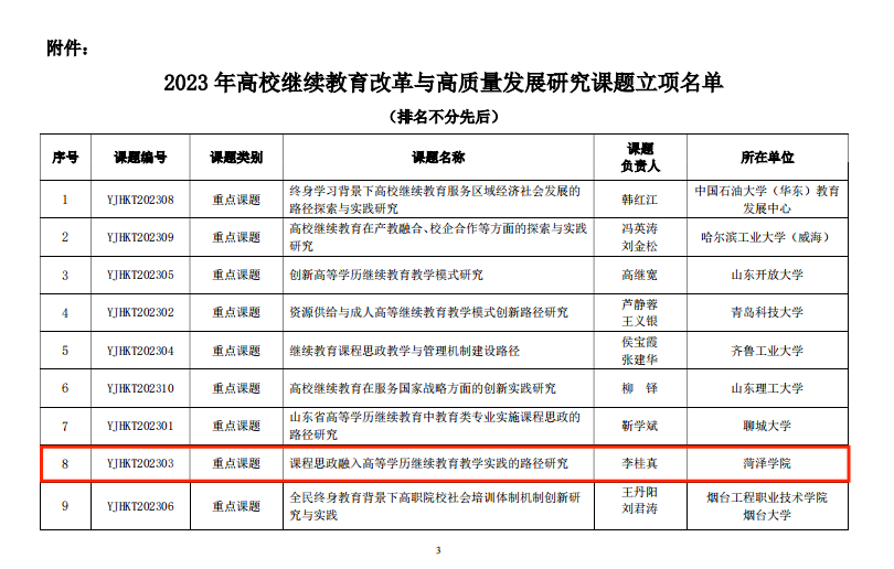 近日,山东省成人高等教育研究会下发了《关于公布高校继续教育改革与高质量发展研究课题立项结果的通知》,公布了2023年高校继续教育改革与高质量发展研究课题立项名单,Beat365官网Beat365中文官方网站申报的《课程思政融入高等学历继续教育教学实践的路径研究》获批重点课题,获得3000元资助经费,为Beat365官网首次获得的省级成人教育课题立项。