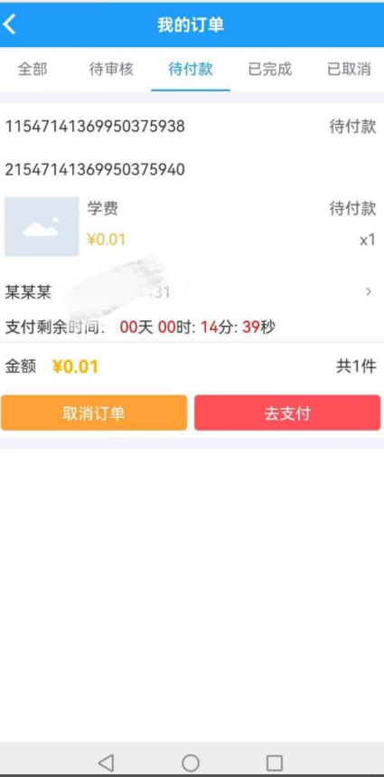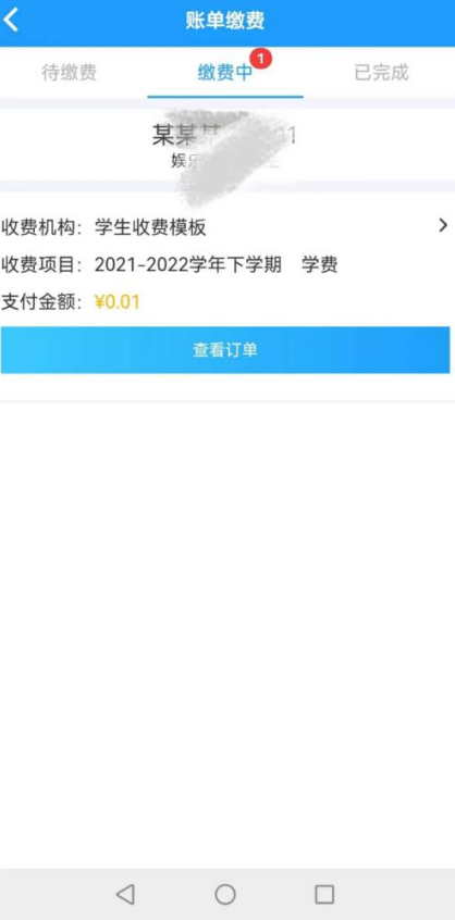 点击进入其中一条账单即可选择取消订单或继续支付。缴费成功后会提示扣款成功,可以看到缴费信息。