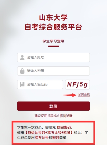 一、强化实践能力培养考核及证书职业能力考核使用“山东大学自考综合服务台”考生个人中心登录端网址:https://www.zk.sdu.edu.cn/DegreeSdZK/DegreeSdZK/SdstuLogin(建议学生使用谷歌、火狐、IE9以上浏览器使用平台),学生第一次登陆需要使用【身份证号码+准考证号+姓名】找回密码,修改密码成功之后再去使用【准考证号+密码】登陆。