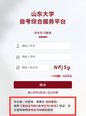 一、强化实践能力培养考核及证书职业能力考核使用“山东大学自考综合服务台”考生个人中心登录端网址:https://www.zk.sdu.edu.cn/DegreeSdZK/DegreeSdZK/SdstuLogin(建议学生使用谷歌、火狐、IE9以上浏览器使用平台),学生第一次登陆需要使用【身份证号码+准考证号+姓名】找回密码,修改密码成功之后再去使用【准考证号+密码】登陆。