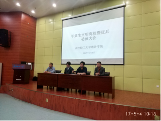 5月4日上午,新葡的京集团3512vip领导以及全体毕业生于学校金银湖图书馆附三楼学术报告厅举行了毕业生文明离校暨征兵动员大会。学院院长张聪、党委书记肖波明、副院长高全胜,以及学工主任刘兴权和辅导员徐彩霞分别对文明离校和征兵动员等作出详细说明和指导。大会全程由刘兴权主任主持。