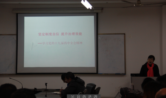 12月19日,新葡的京官网在数计楼东七310会议室举办十九届四中全会精神等形势政策专题宣讲会,学校马克思主义学院汪早容副教授作了《解读香港局势,维护“一国两制”》、《坚定制度自信,提升治理效能——学习党的十九届四中全会精神》两场专题报告,全体教职工聆听了报告,学院党委副书记谢慧荣主持了报告会。