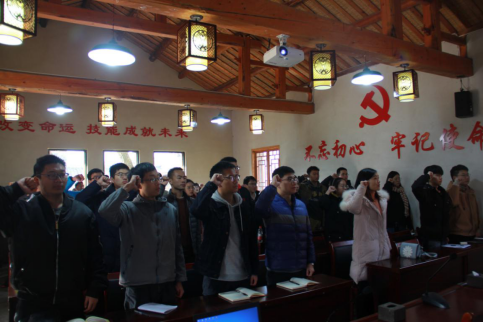在会议室,由张新娅老师领誓,全体党员重温入党誓词,并观看了宣传片《金岭之变》。
