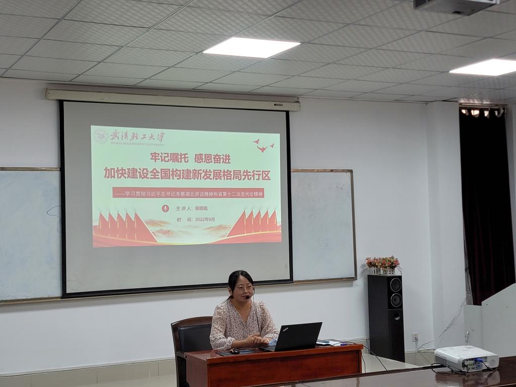 侯德娟博士以《牢记嘱托 感恩奋进 加快建设全国构建新发展格局先行区》为题,全面阐述了习近平总书记考察湖北重要讲话精神的核心要义和精神实质,深入剖析了省第十二次党代会报告的思维框架和内在逻辑。宣讲紧扣省情、校情,主旨清晰、内容丰富,既有理论上的深刻感悟,也有实践中的升华提炼,对全体教职工进一步准确把握习近平总书记考察湖北重要讲话精神和省第十二次党代会精神,凝聚力量推动学院高质量发展具有重要指导作用。