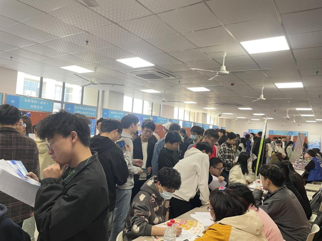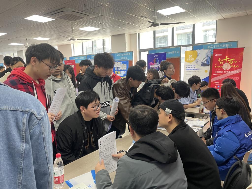 招聘会从上午十点开始,现场春意盎然,人头攒动,同学们求职热情高涨。招聘企业通过宣传展板、招聘手册、现场宣讲等方式向毕业生推介公司情况、岗位需求和薪资福利待遇,并与大家面对面沟通交流,耐心解答同学们关心的问题。毕业生手持简历,在东软集团(武汉)有限公司等多个专业对口企业面前驻足排队,企业招聘工作人员认真筛选和评估学生的简历,充分认可学生的综合素质和专业技能,并尽快安排面试聘用部分优秀学子。