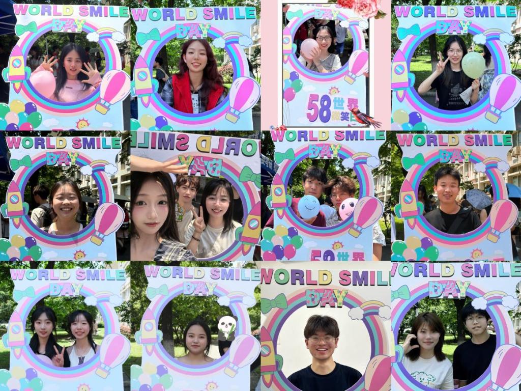 “你知道今天是世界微笑日吗?”“今天你微笑了吗?”公共服务部门的干事用幽默的语言引导同学们分享自己的快乐,阳光下,同学们眉眼盈盈地回答道,在幽默的对话中,瞬间化解心中繁杂的情绪。本次活动包括“微笑签到墙”“情绪展示”“你笑起来真好看--微笑加一”等环节,大家纷纷拿起马克笔在签名墙上写下“要像太阳一样”“天天开心”“烦恼退散”等话语。