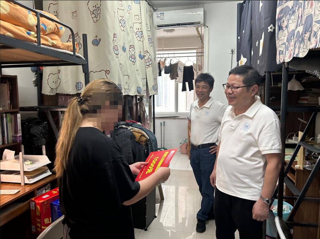 7月12日,数计学院党委书记孟三爱、副书记章三带领辅导员先后走访了位于金银湖校区禾园9舍、武汉市新洲区的3名学生,给学生带去关怀、慰问和鼓励,并代表学校送上慰问金与精美文创礼品。