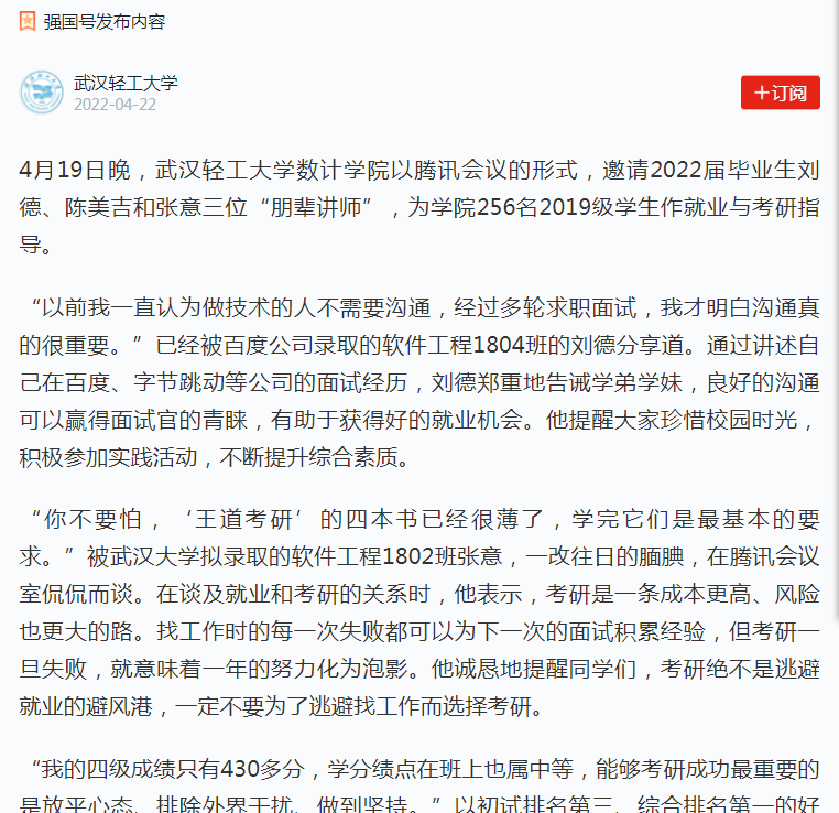 4月19日晚,新葡的京集团3512vip数计学院以腾讯会议的形式,邀请2022届毕业生刘德、陈美吉和张意三位“朋辈讲师”,为学院256名2019级学生作就业与考研指导。