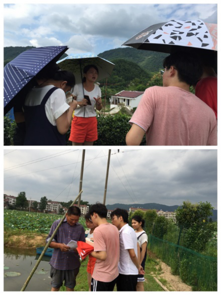 在其蔬菜水稻种植基地和水产养殖基地,实践团队了解到,在企业统一指导下,当地的蔬菜不打农药,注重天然有机无公害,而每当蔬菜成熟时,由企业集中收购和销售。在水产养殖基地,大家了解到,该基地实行的是立体化养殖,表面是荷花莲蓬,水中饲养了甲鱼,水下则是莲藕种植,这样高效的利用了土地,使农民利益实现了最大化。
