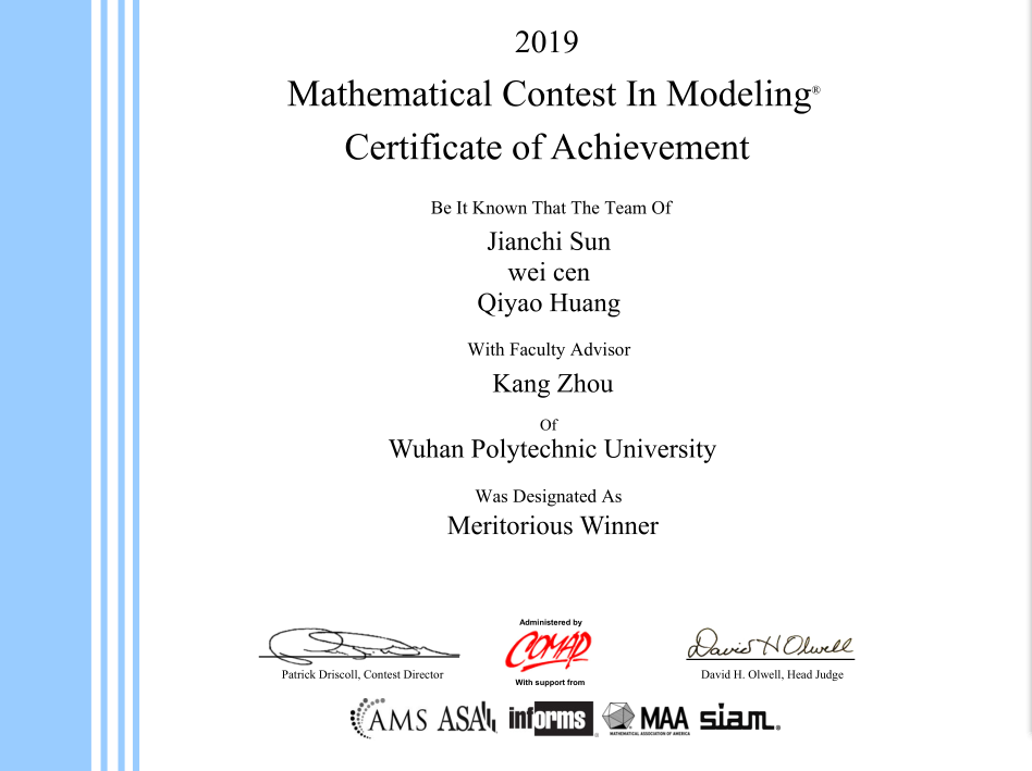 近日,2019年美国大学生数学建模竞赛评审结果正式公布,由新葡的京官网2016级本科生孙见弛作为负责人的参赛团队荣获一等奖(Meritorious Winner),创我校本科生参赛以来的最好成绩。
