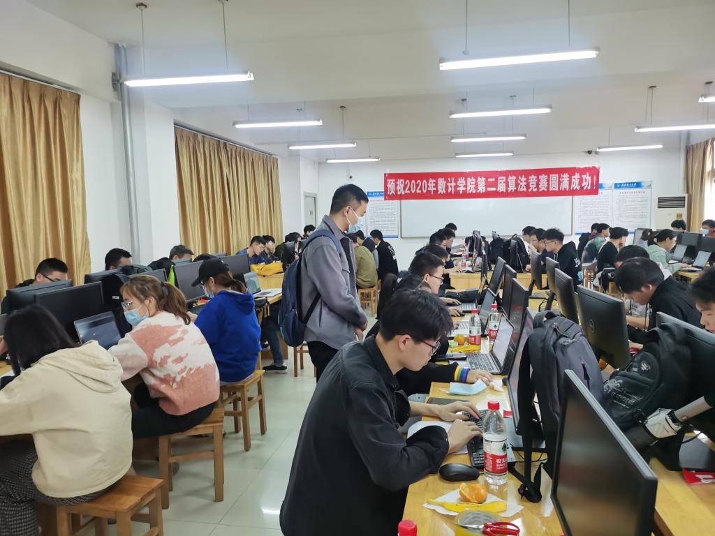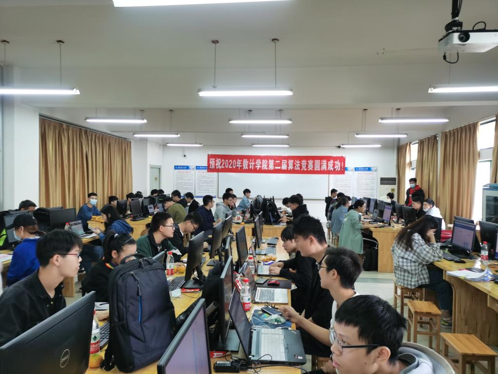 10月25日下午,在金银湖东八楼的401、403和405三个实验室里,嗡嗡的主机运行声,噼里啪啦的键盘敲击声,笔尖划过纸张的沙沙声,声声入耳,数计学院第二届算法竞赛正在举行。本次比赛由数计学院算法协会承办,来自计算机科学与技术、信息与计算科学、网络工程、软件工程、数字媒体技术、信息管理、大数据等七个专业的165名同学汇聚于此,与代码展开了一场没有刀光剑影的厮杀。