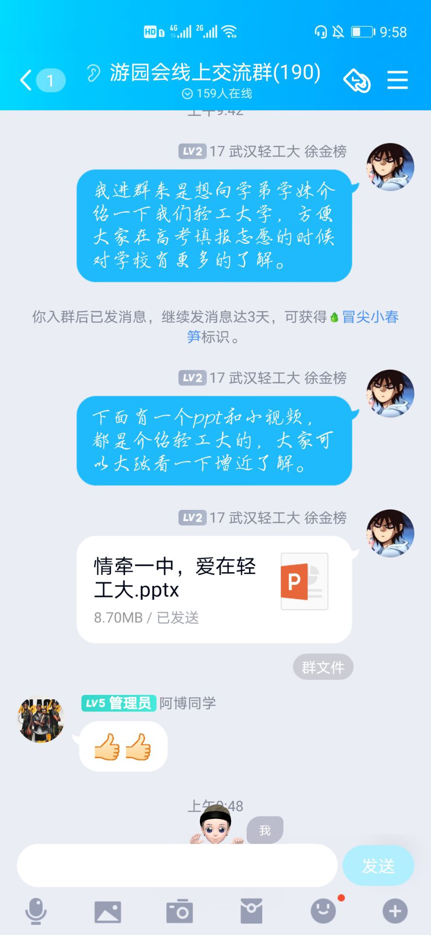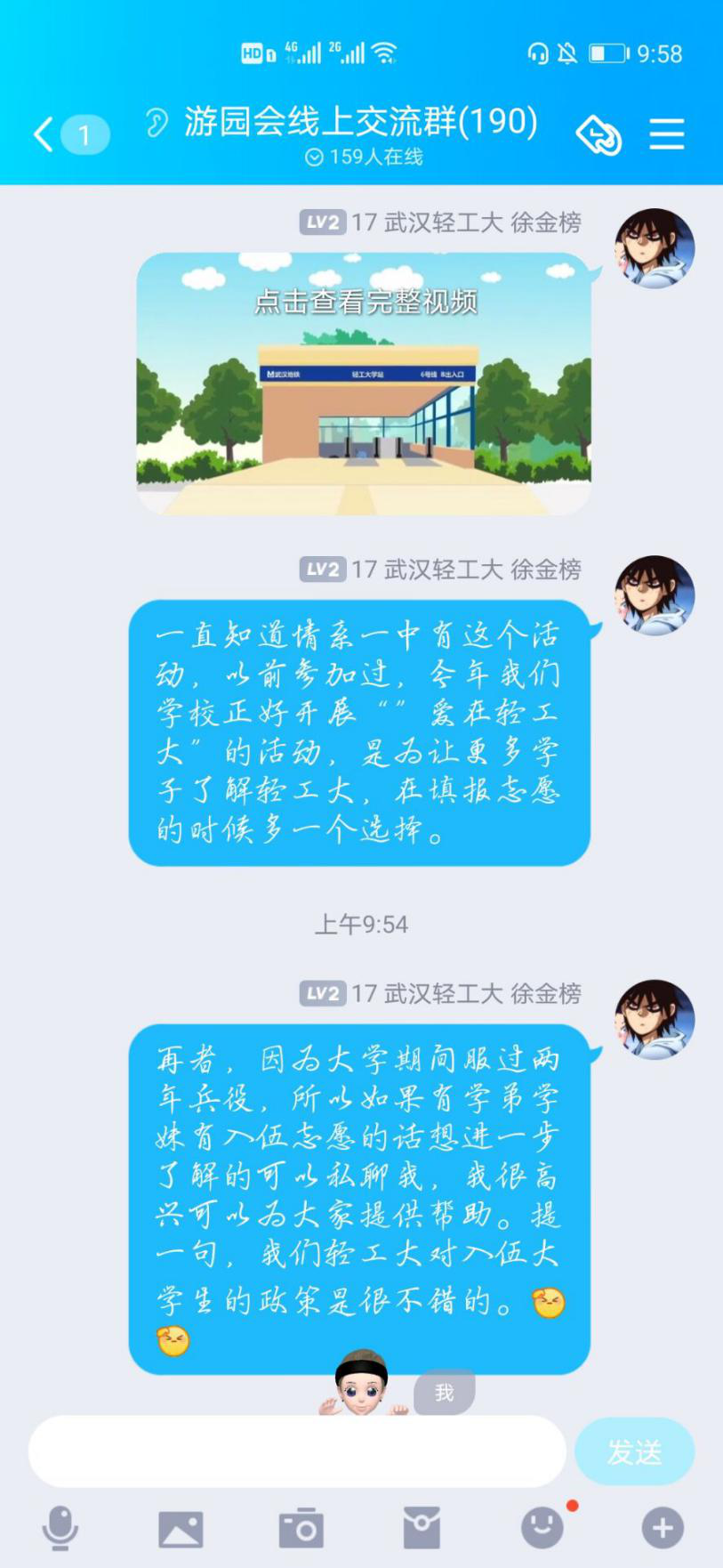 2月4日,我进入了英山一中游园会的线上交流群。此次游园会活动在增进一中学子对大学的了解,帮助其尽早树立考学目标上有着重要的意义。我将轻工大学的宣传资料发进群里,同时借助自己的参军经历,吸引到同学向我询问了解新葡的京集团3512vip.
