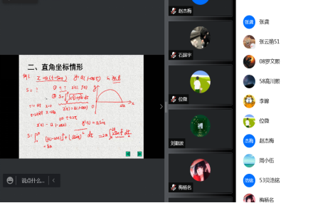 由于疫情原因,课程不得不采用在线上课的方式,但是同学们都非常认真,积极参与。本次课程,王庆芳老师介绍了《数学分析》中的平面弧长的概念和应用,利用折线代替曲线这一思想,结合具体的实例,按照由浅入深的学习规律,循序渐进,逐步引入直角坐标系下的计算公式,进而坐标变换,考虑在极坐标系上的计算方式,内容通俗易懂、重点突出。这个过程中,学生也体会了以直代曲、有限与无限、量变与质变、对立与统一的辩证思想,完成了曲线积分的重难点突破,也折射出人生智慧:将人生中每一个大目标分割成一个个具体的小目标,然后踏踏实实的去实现,这样坚持下去积少成多,终将实现大目标。对于中华民族的伟大复兴也是一样,需要全国人民齐心协力,终将完成伟大梦想。课堂上,同学们认真听讲,积极发言,并就具体问题的计算展开了讨论,如椭圆曲线的周长,心形线的周长等。