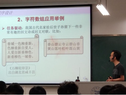 胡瑞鹏老师以出自湖北省咸丰县的一首有趣的古诗《万柳堤即景》:春城一色柳垂新,色柳垂新自爱人。人爱自新垂柳色,新垂柳色一城春。和一幅对联:香山碧云寺云碧山香,黄山落叶松叶落山黄。为引,让学生先感受一下回文古诗和回文对联的美,然后能够充分理解回文串的特点,进而进入编程例题--用程序实现回文串的判断。既让学生充分掌握了回文串的收尾字符完全相同的特点,又为其求编程中实现的方向与道路。这样中由古诗文联入题,引入到学习中的计算机知识,不落窠臼的同时,也不失为新颖的模式,使得我们在实现思政课的同时也多了一份古韵。